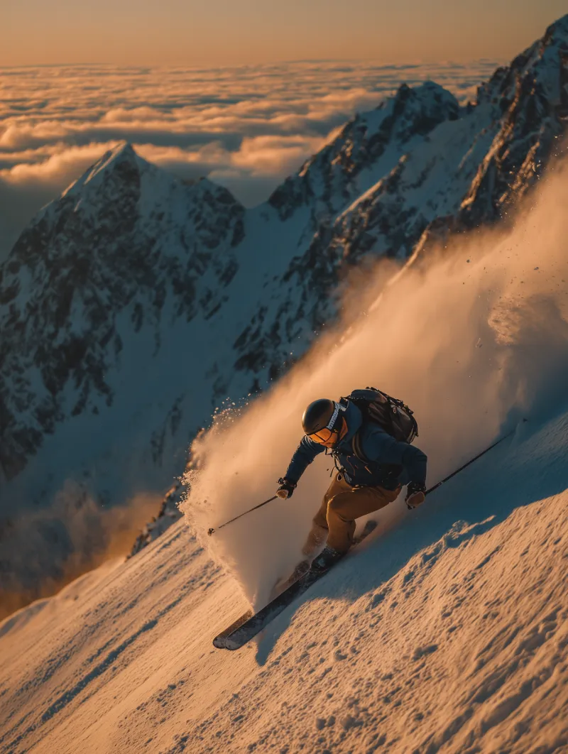 Skier carving powder on steep mountain at sunset