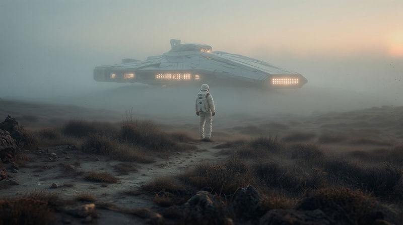 Astronaut Facing Hovering Sci-Fi Spaceship