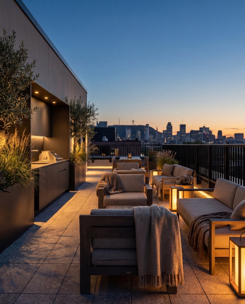 Modern rooftop lounge at sunset
