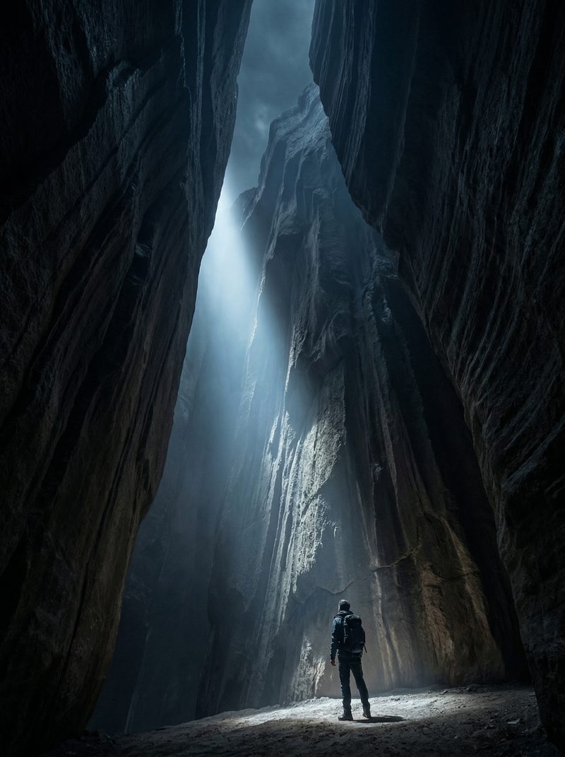 Hiker in a narrow canyon with sunbeam