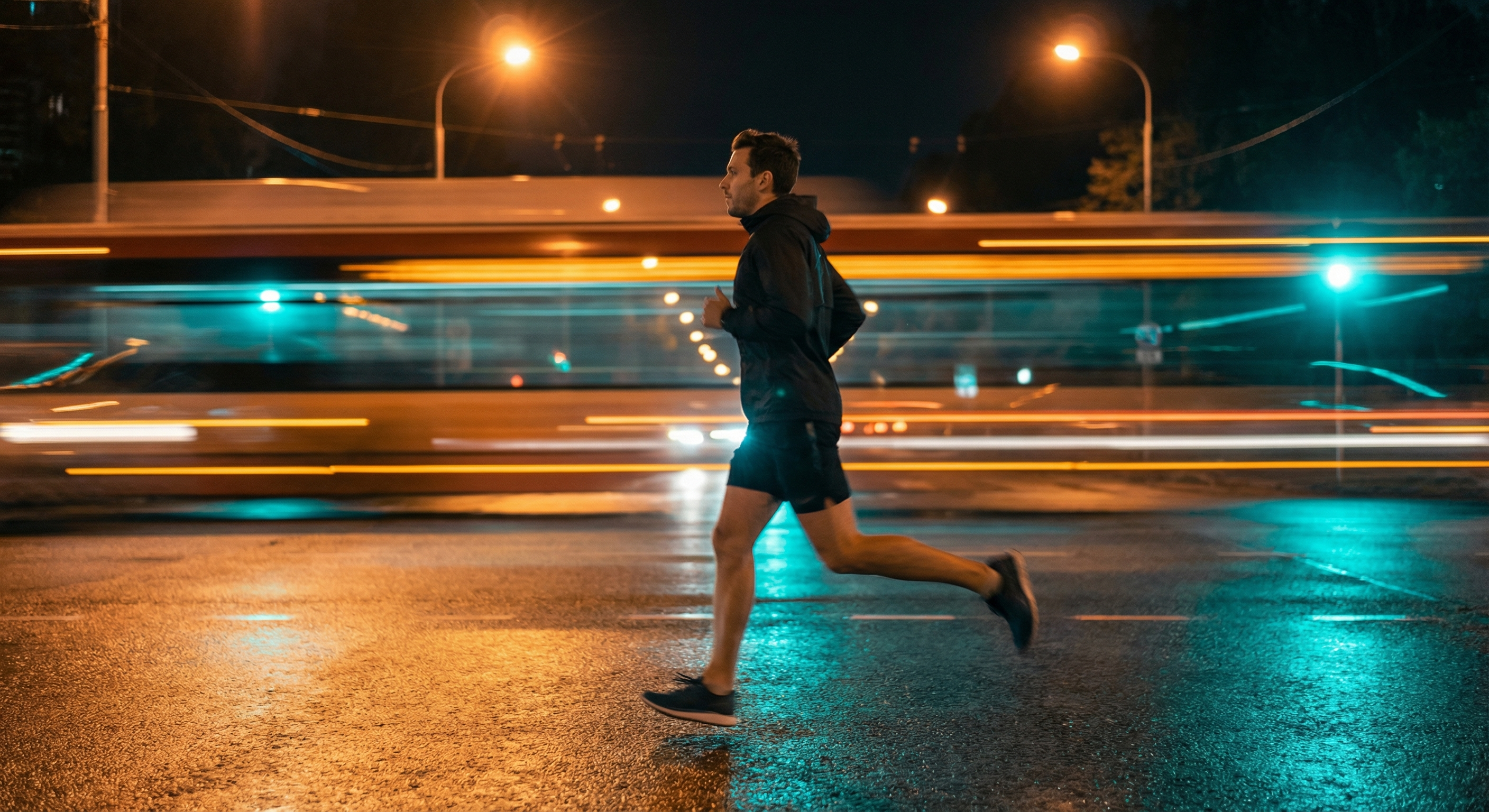 Night Runner in City Street with Light Trails