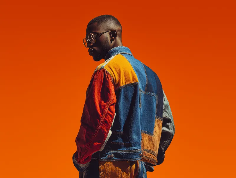 Stylish Man in Patchwork Denim Jacket Against Orange Background