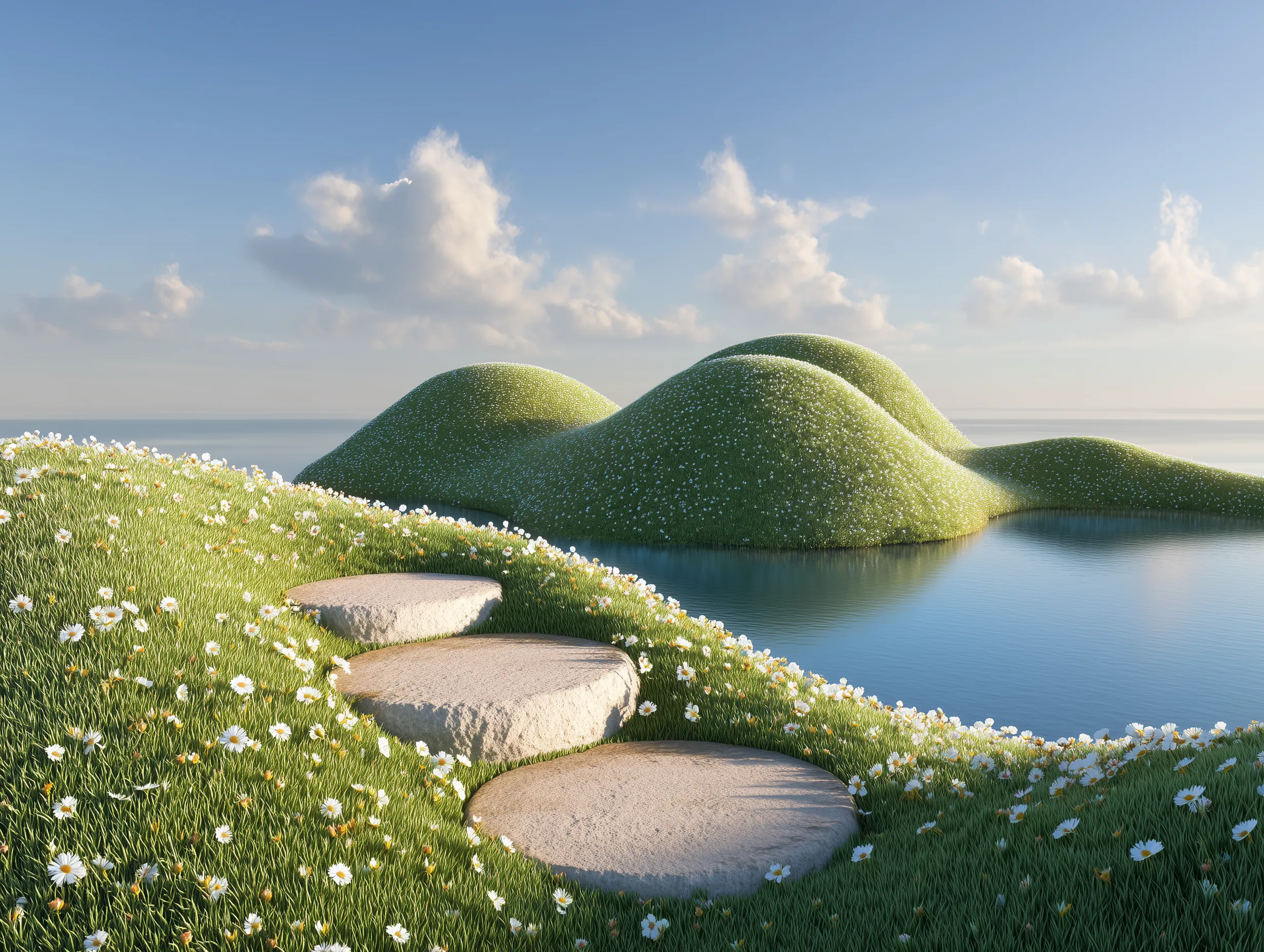 Dreamy Surreal Meadow with Stepping Stones and Lake