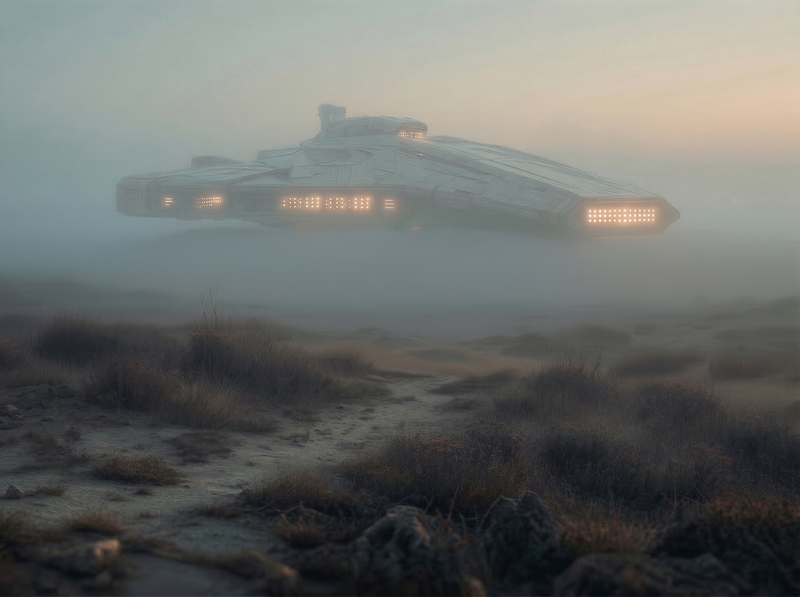 Futuristic Hovercraft in Foggy Wasteland