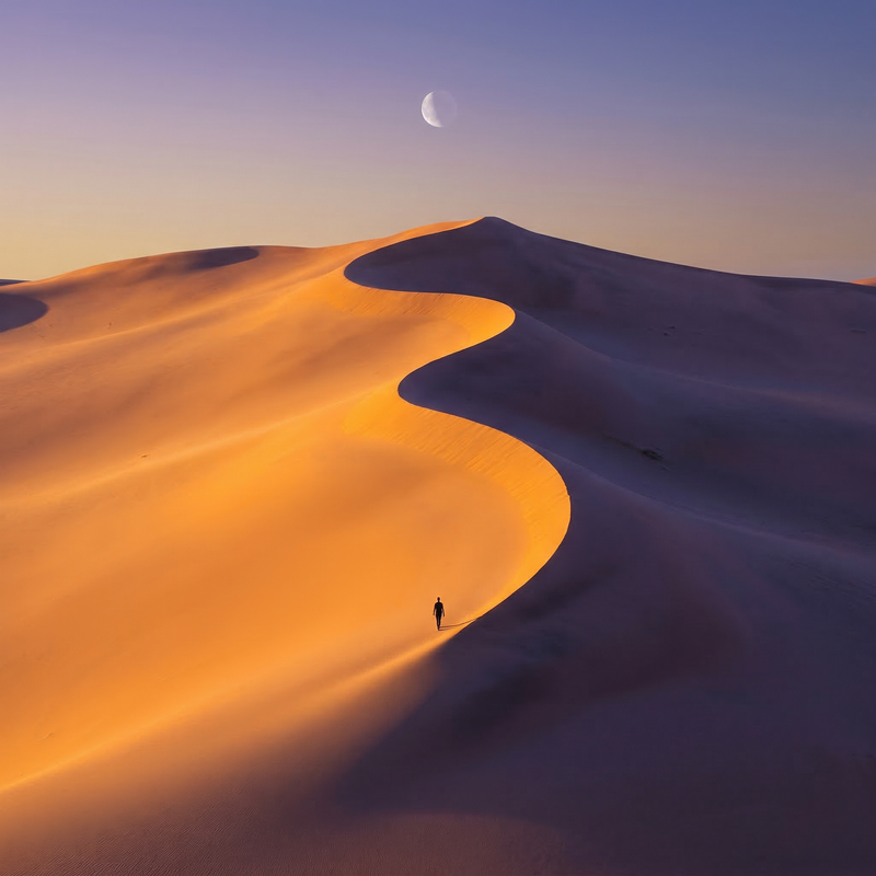Lone Figure Crossing Desert Dunes at Dusk