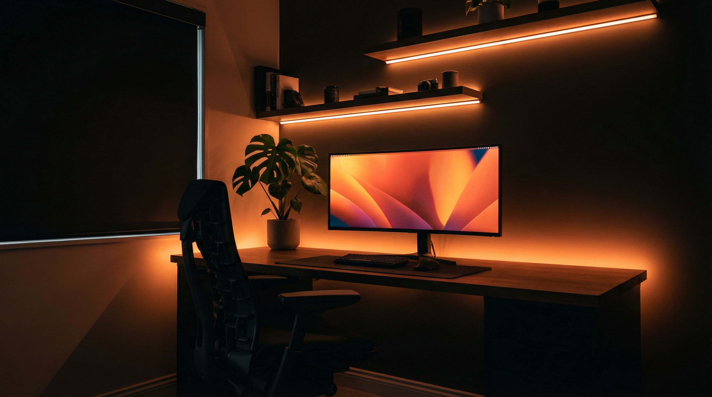Minimalist desk setup with warm ambient lighting