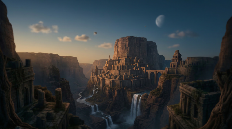 Fantasy Cliffside City with Waterfalls