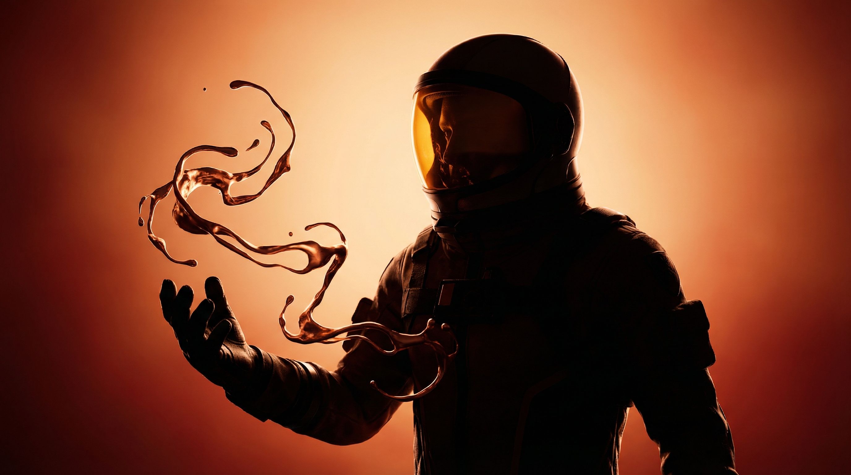 Silhouetted astronaut with floating liquid