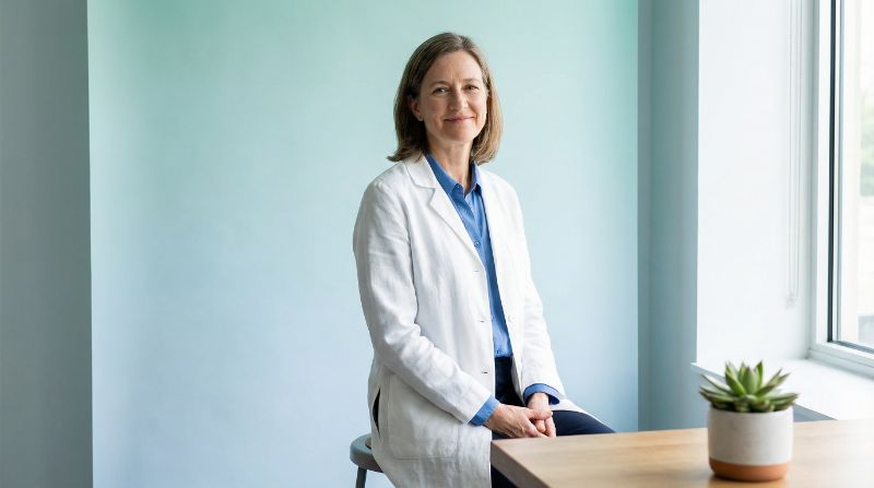 Smiling professional in white coat by window