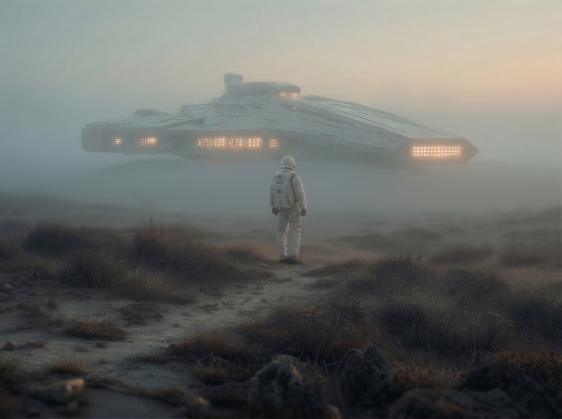 Astronaut Facing a Foggy Alien Spacecraft
