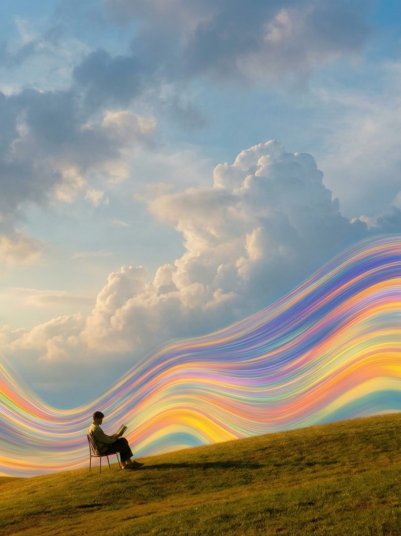 Person Reading by Hill with Rainbow Light Trail
