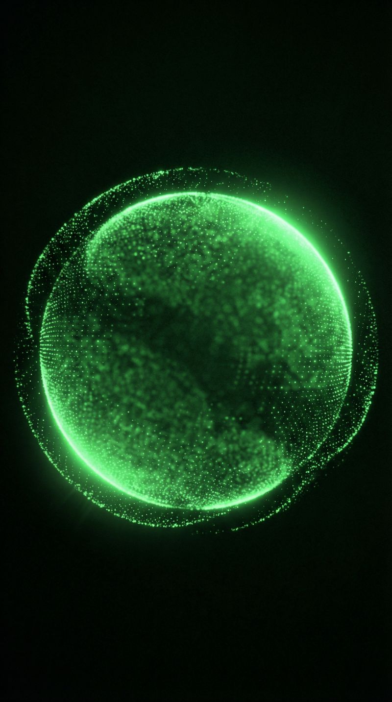 Glowing green digital sphere on dark background