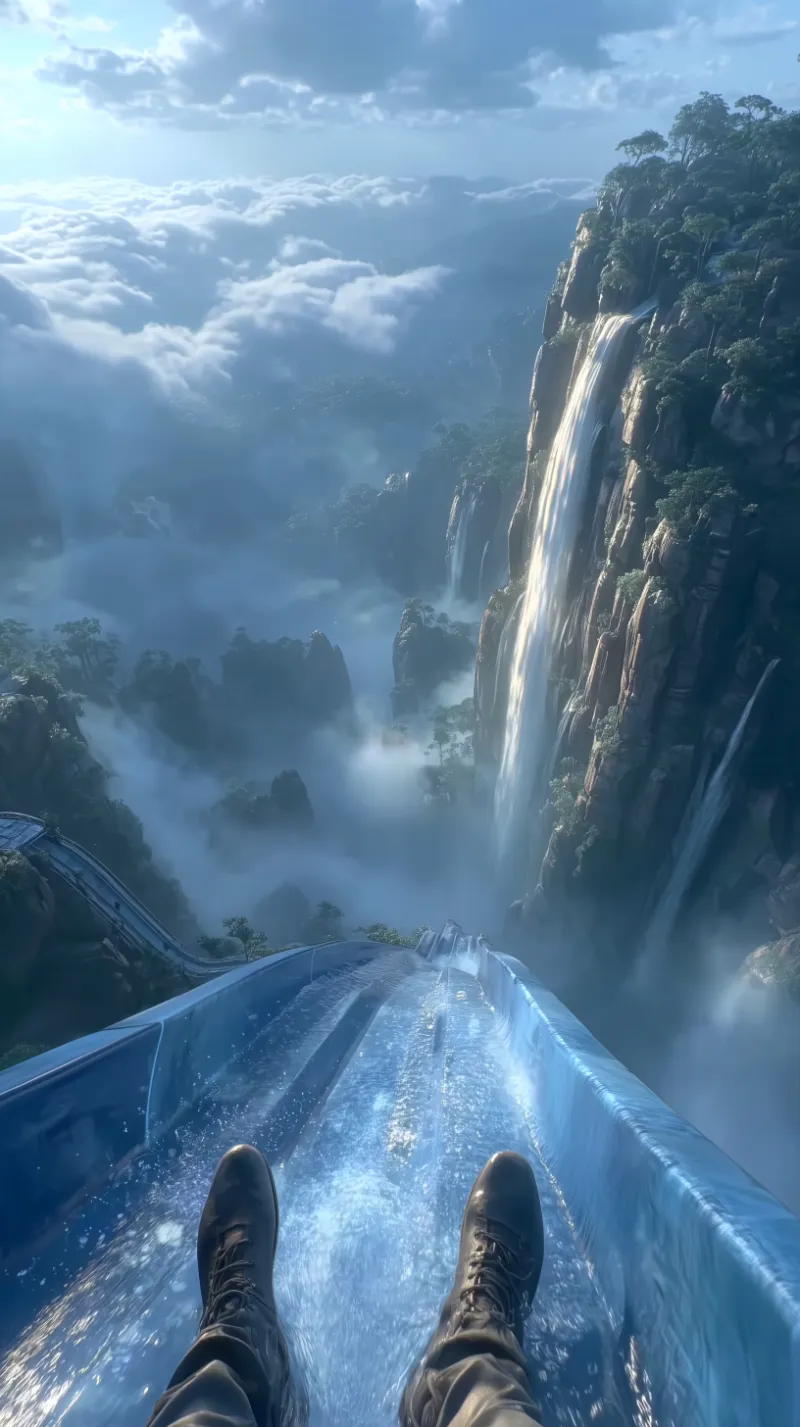 POV water slide above cloud-wrapped mountain waterfalls