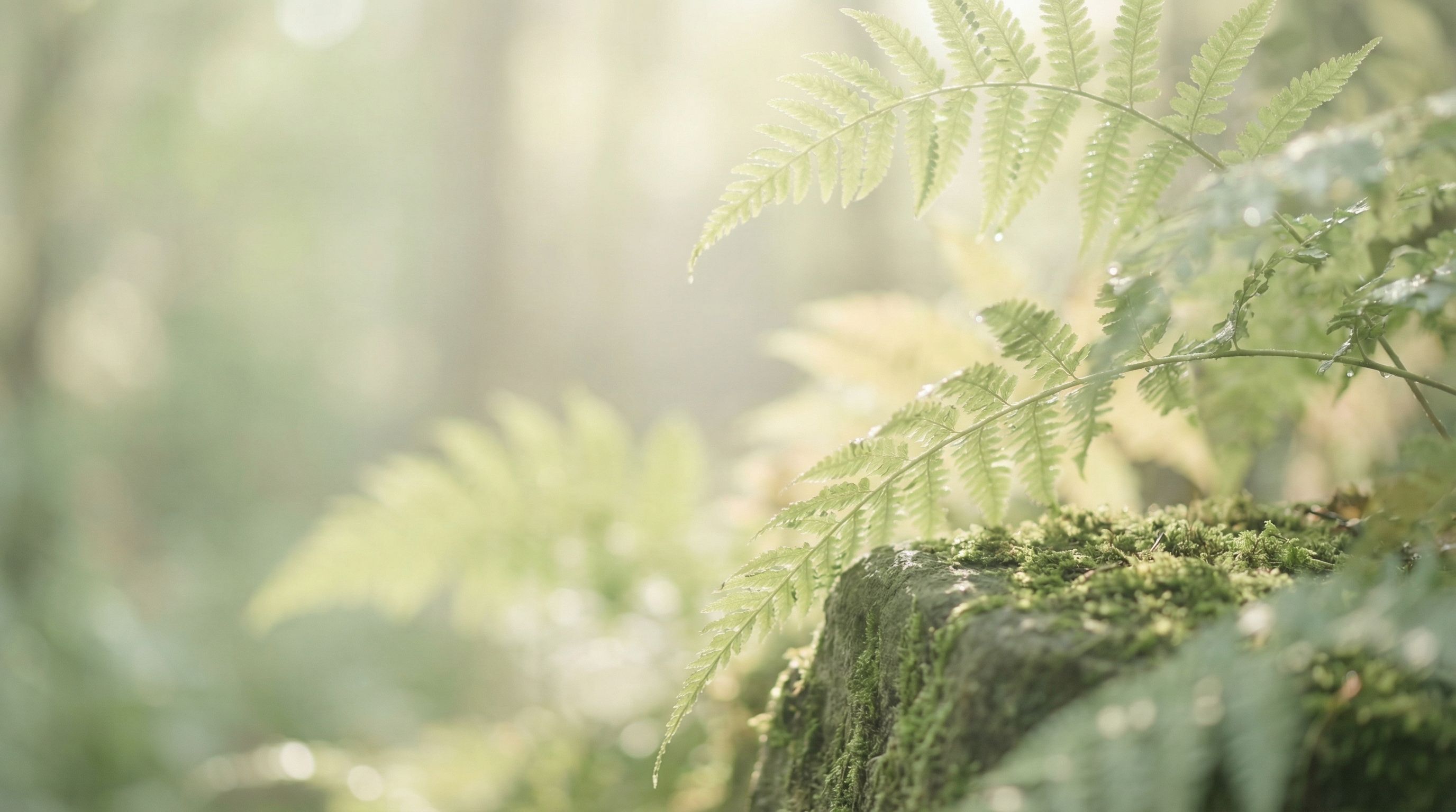 Sunlit fern leaves over mossy forest rock