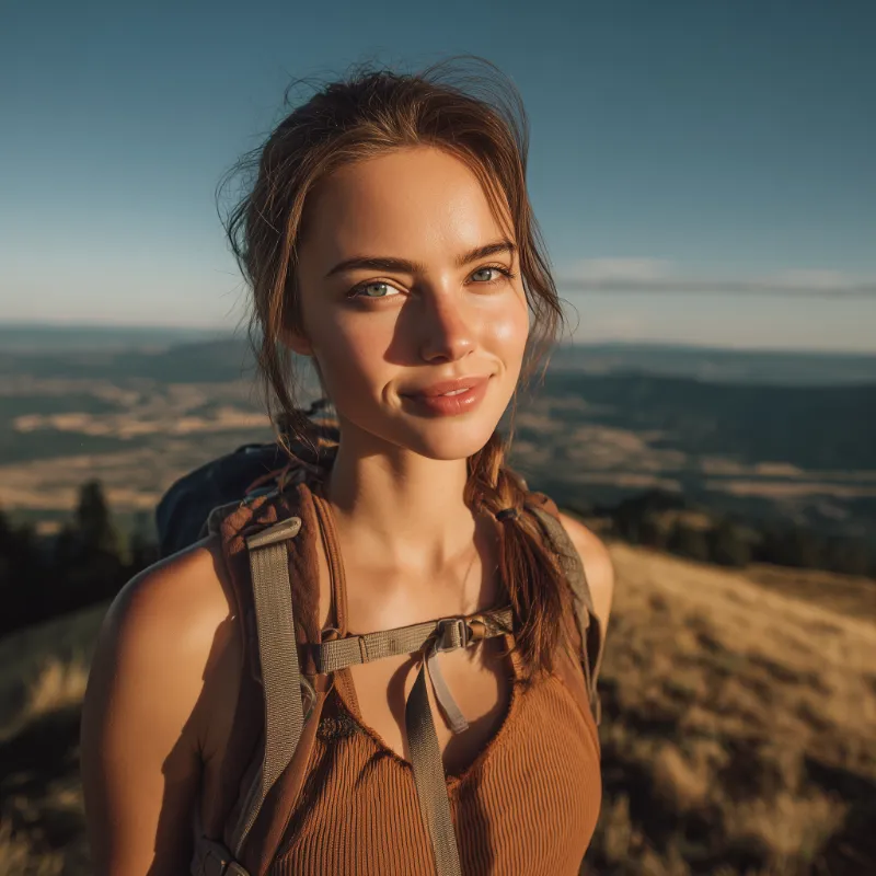 Smiling hiker at sunset on mountain trail – Asset – Aura