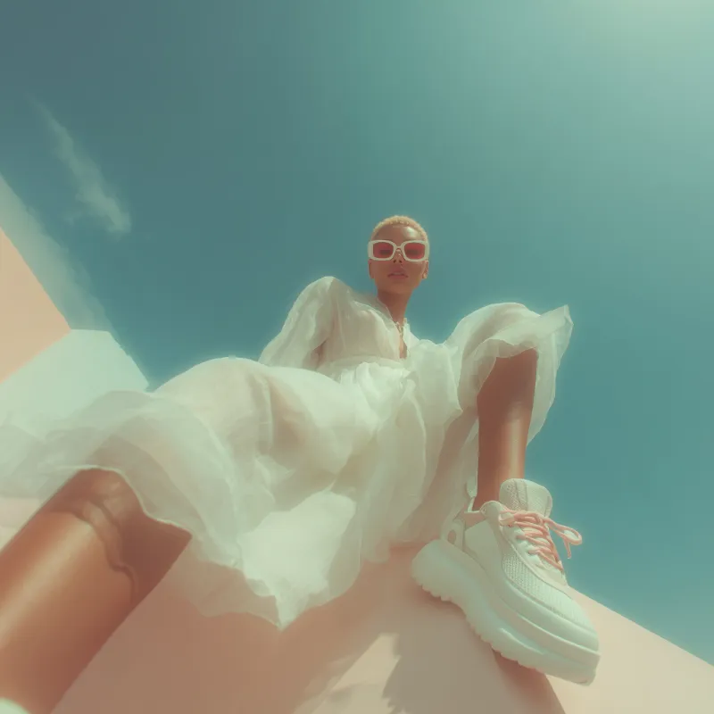 Low-Angle Fashion Portrait in Teal and Rose