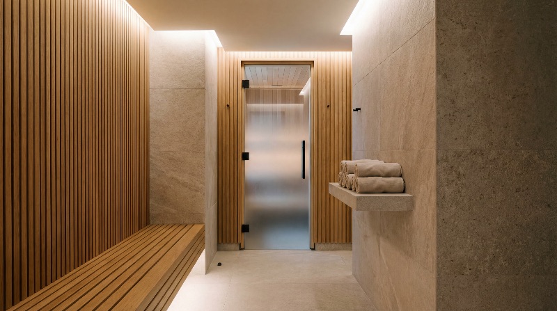 Modern spa sauna corridor with wooden slats