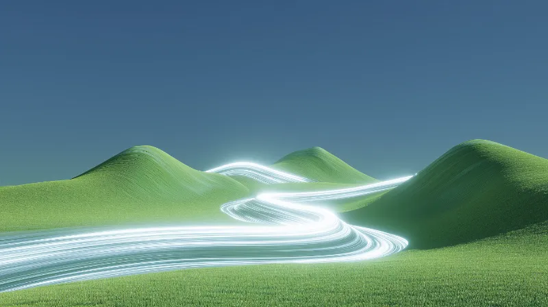 Futuristic light trail through green hills