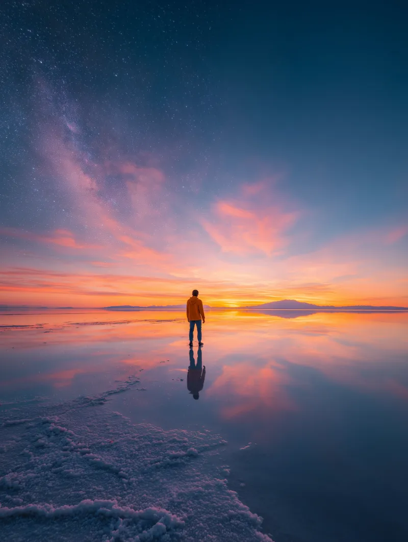 Lone figure on reflective salt flat at vivid sunset