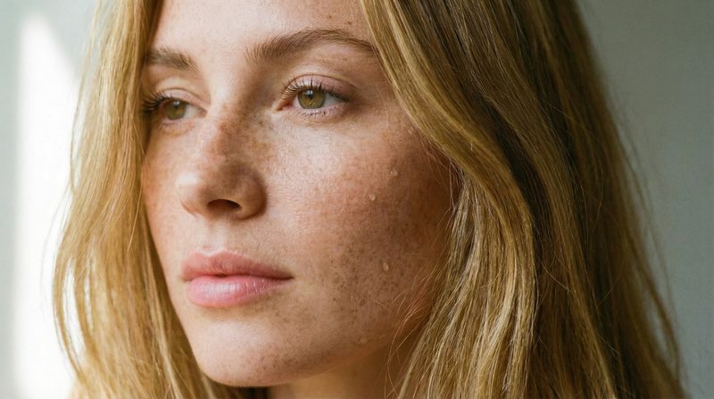 Close-up portrait of freckled woman