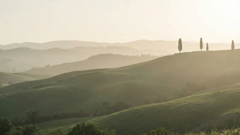 Misty rolling hills at sunrise with cypress trees