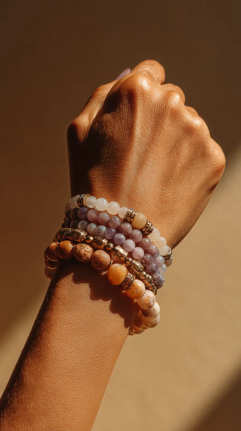 Stacked gemstone beaded bracelets on wrist