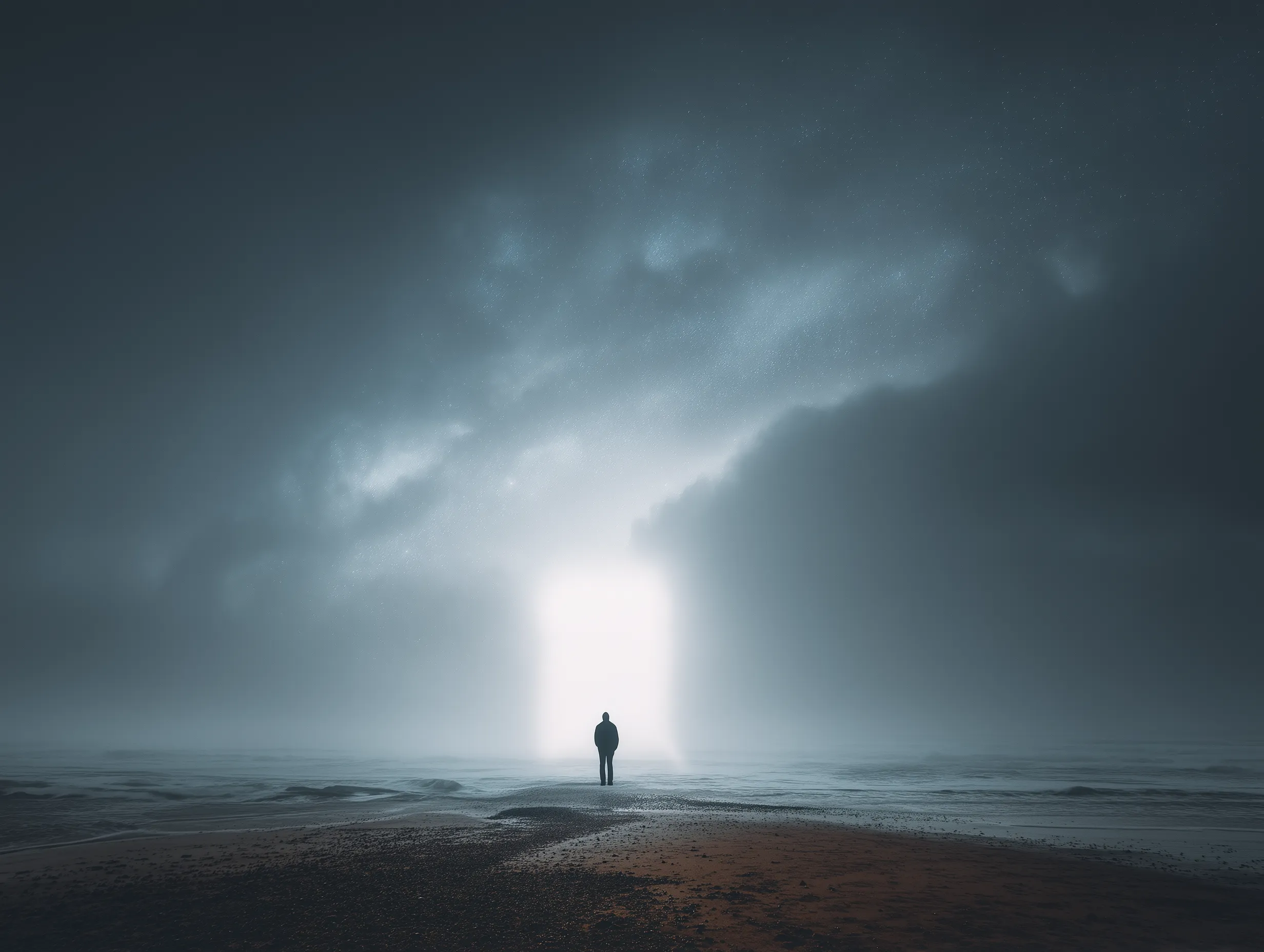 Lone Silhouette Facing Ethereal Light on Misty Shoreline