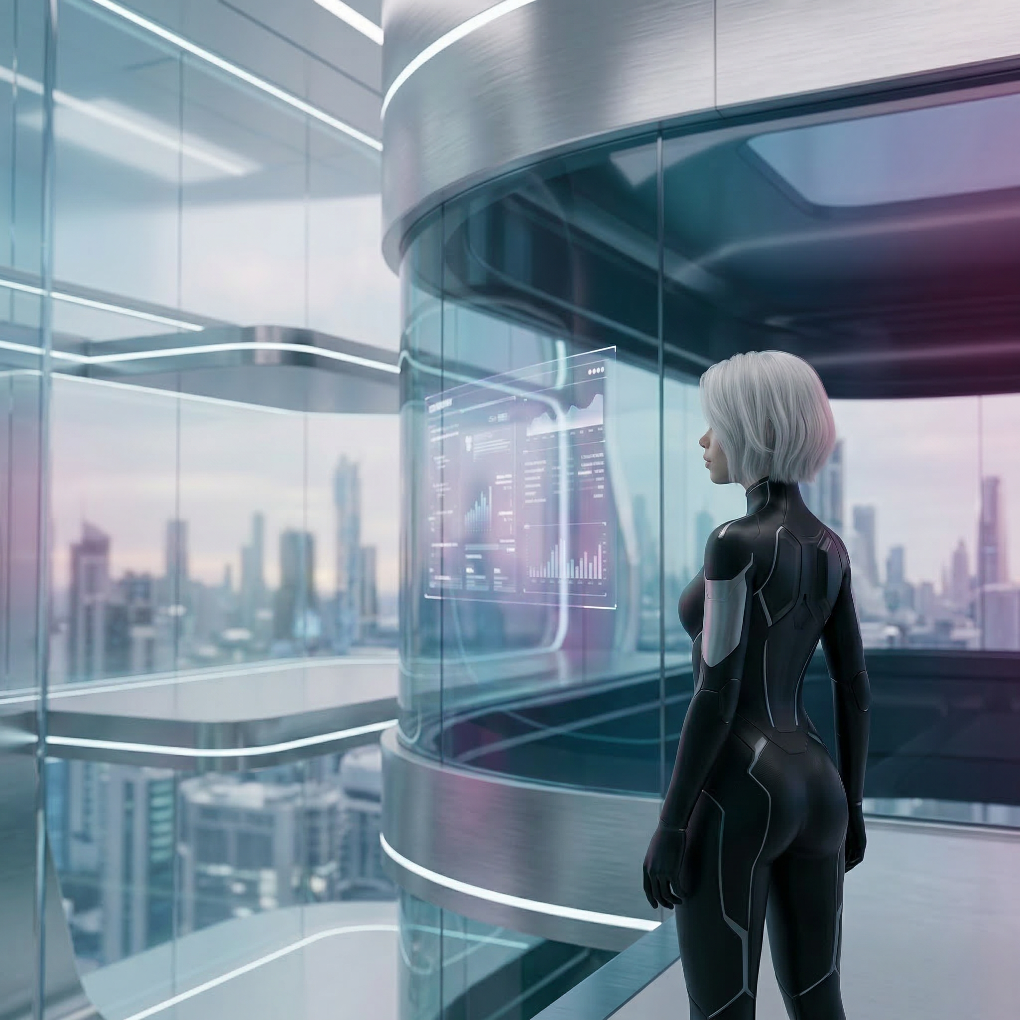 Futuristic Android in Smart Glass Office