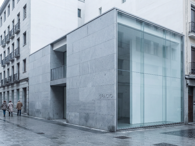 Minimalist glass and stone city storefront