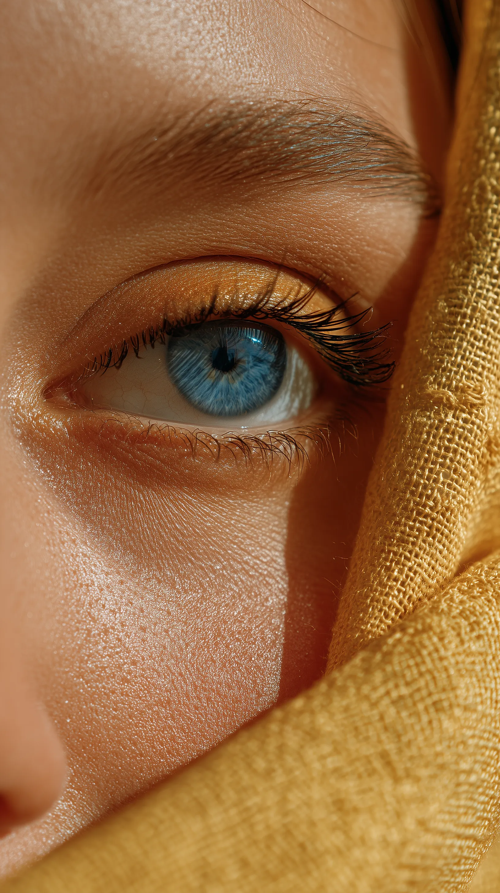 Macro portrait of blue eye with yellow fabric