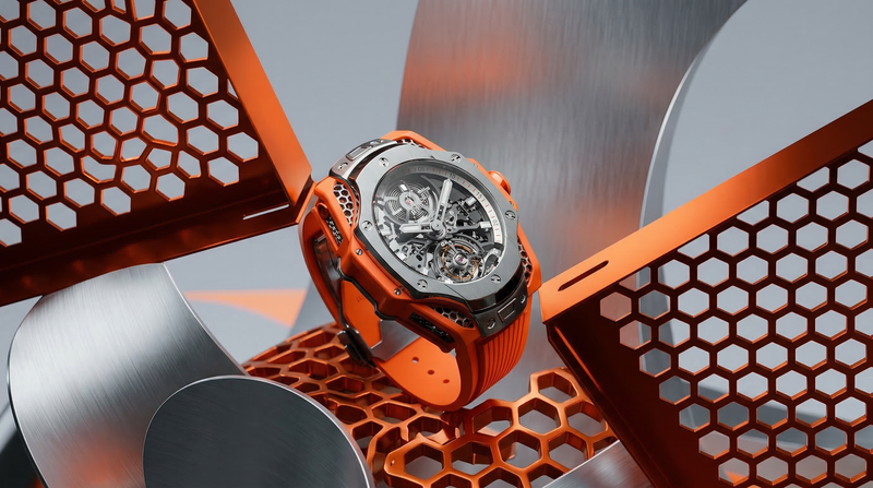 Orange Skeleton Luxury Watch on Metallic Honeycomb