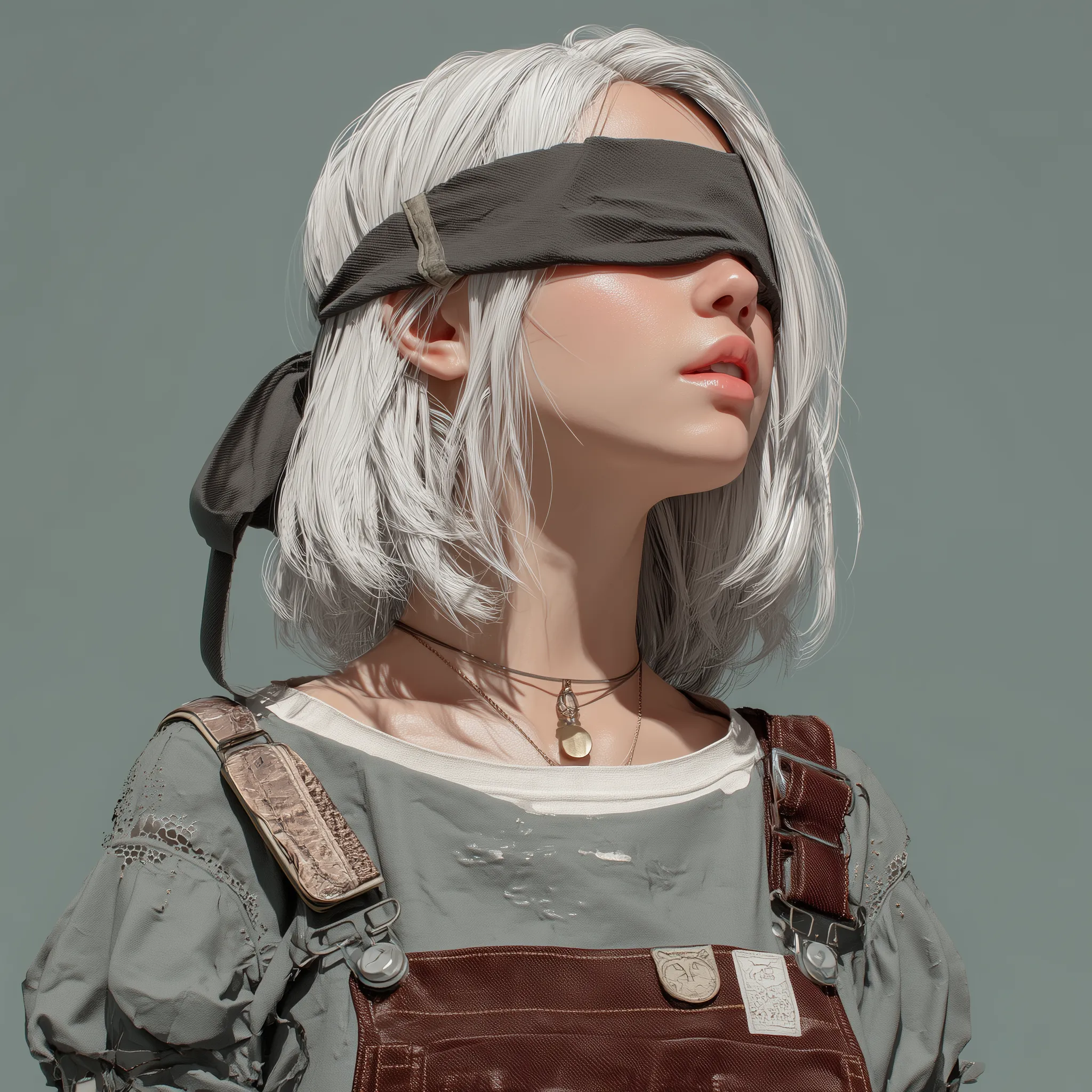 White-haired girl with blindfold in overalls