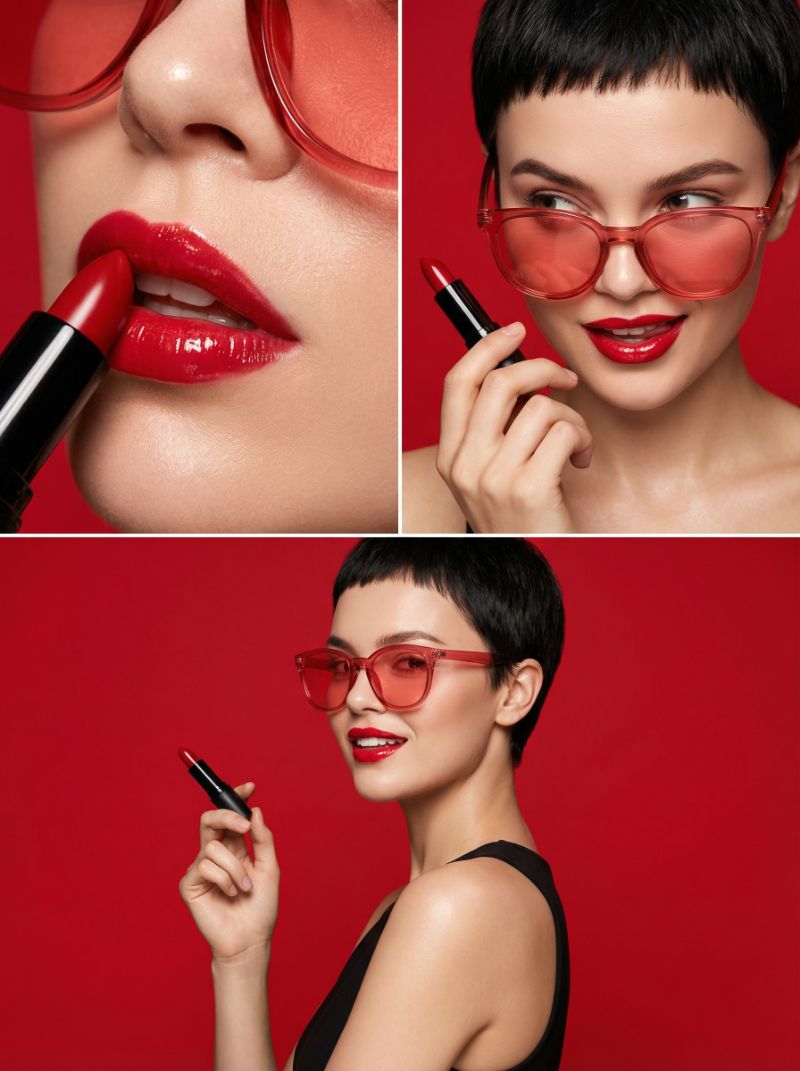 Red lipstick beauty collage on red background