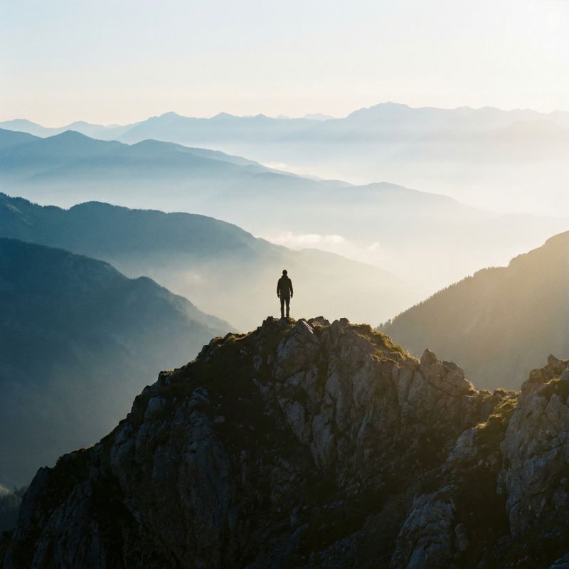 Hiker Silhouette on Mountain Ridge at Sunrise