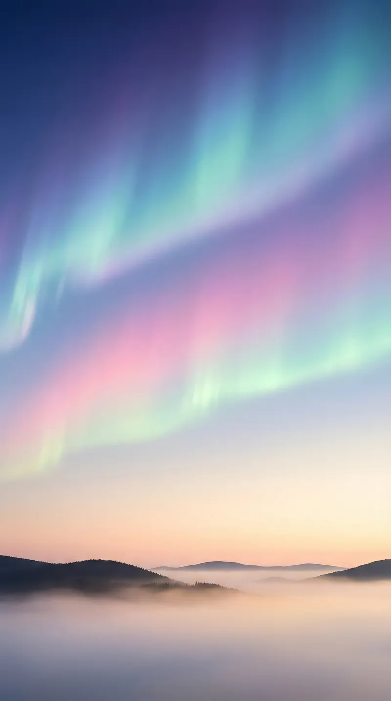 Pastel aurora over misty mountain valley