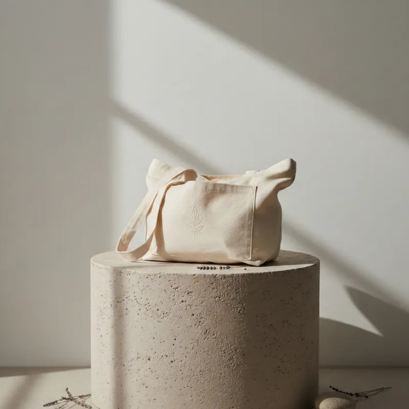 Minimalist beige canvas tote on pedestal
