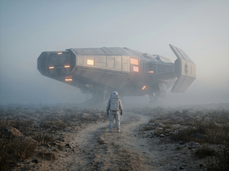 Astronaut Facing Landed Spacecraft in Fog