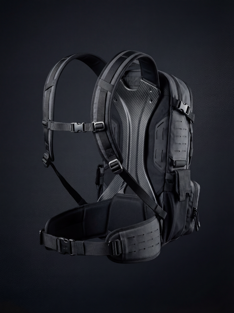 Black tactical backpack with carbon fiber frame | Stock Image & Design Asset – Aura