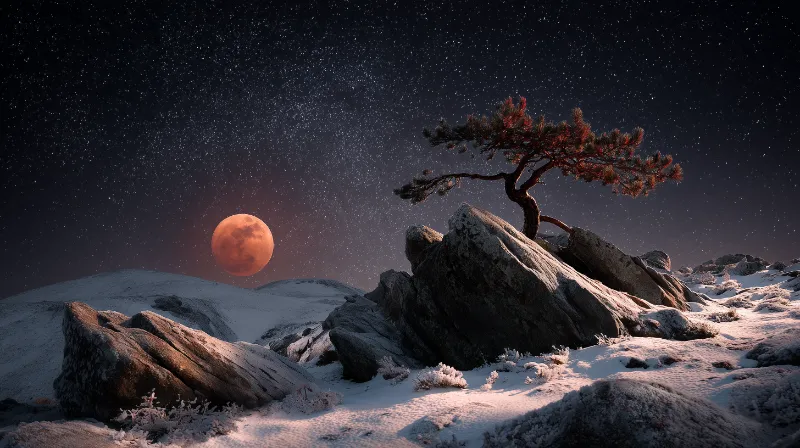 Blood Moon Over Snowy Rocky Landscape