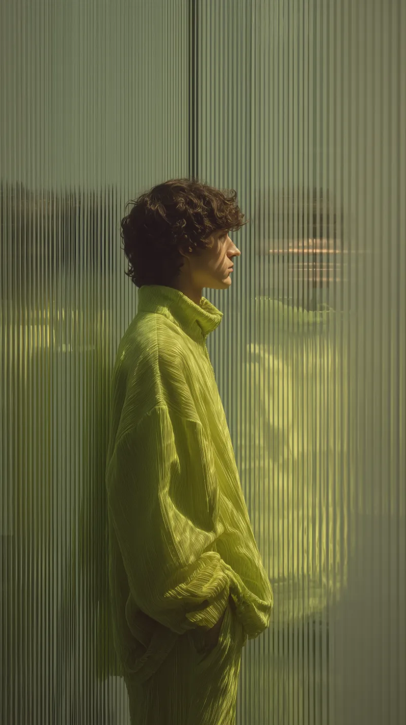 Profile portrait by textured glass wall