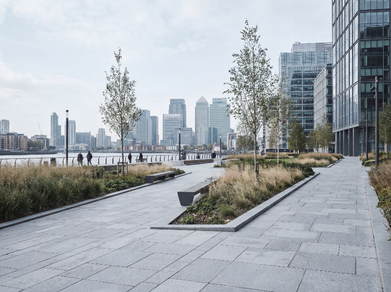Modern riverside promenade with city skyline
