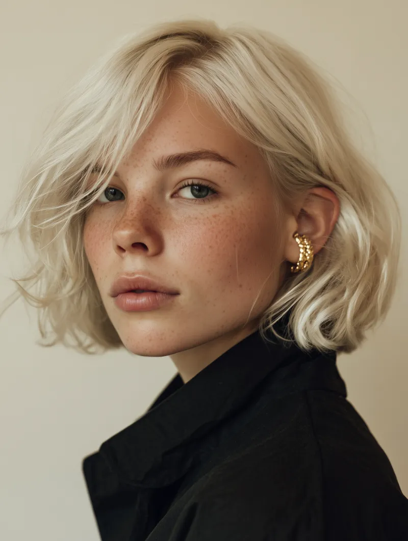 Portrait of a Woman with Platinum Blonde Hair and Freckles