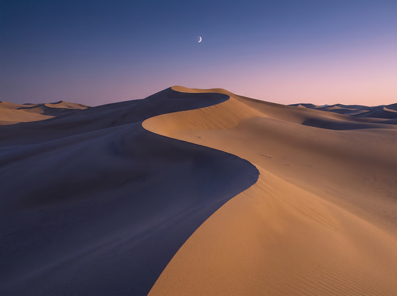 Crescent Moon Over Desert Sand Dunes at Dusk
