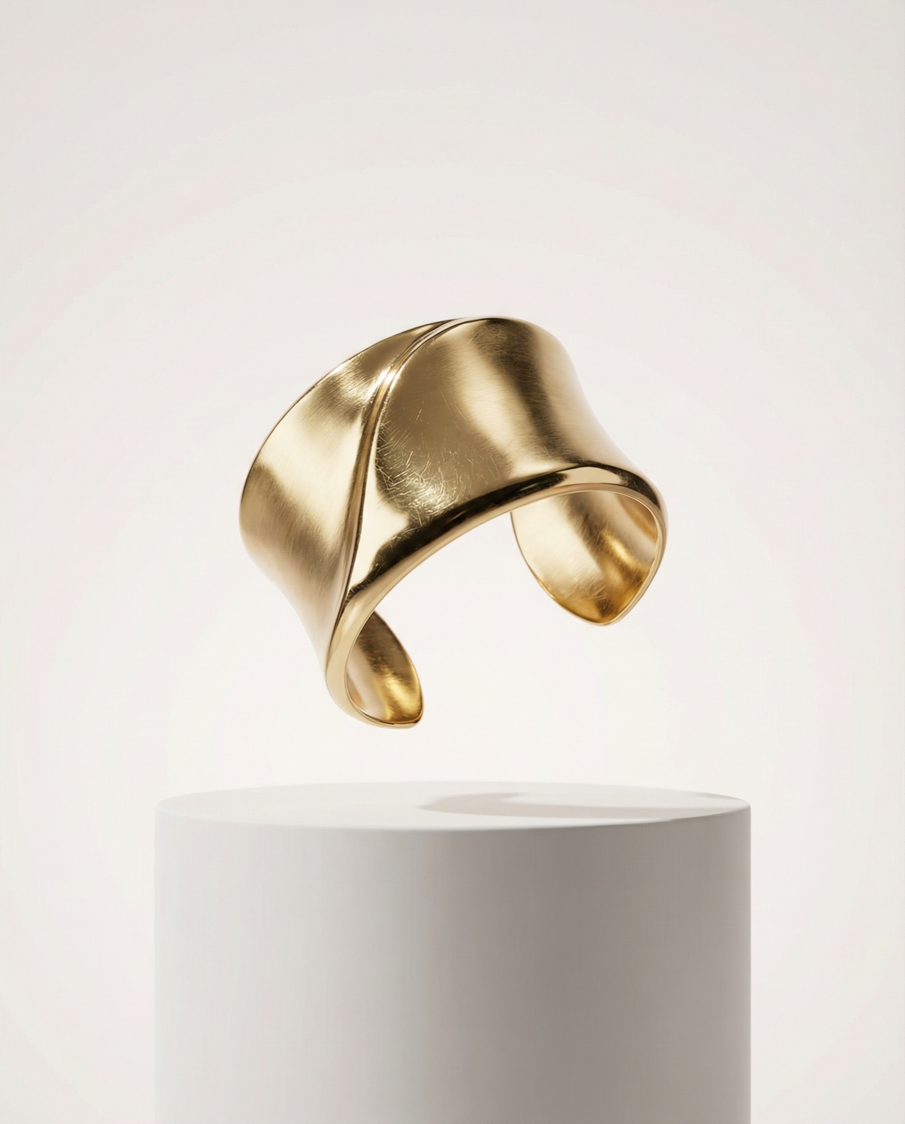 Floating Gold Cuff Bracelet on Minimal Pedestal