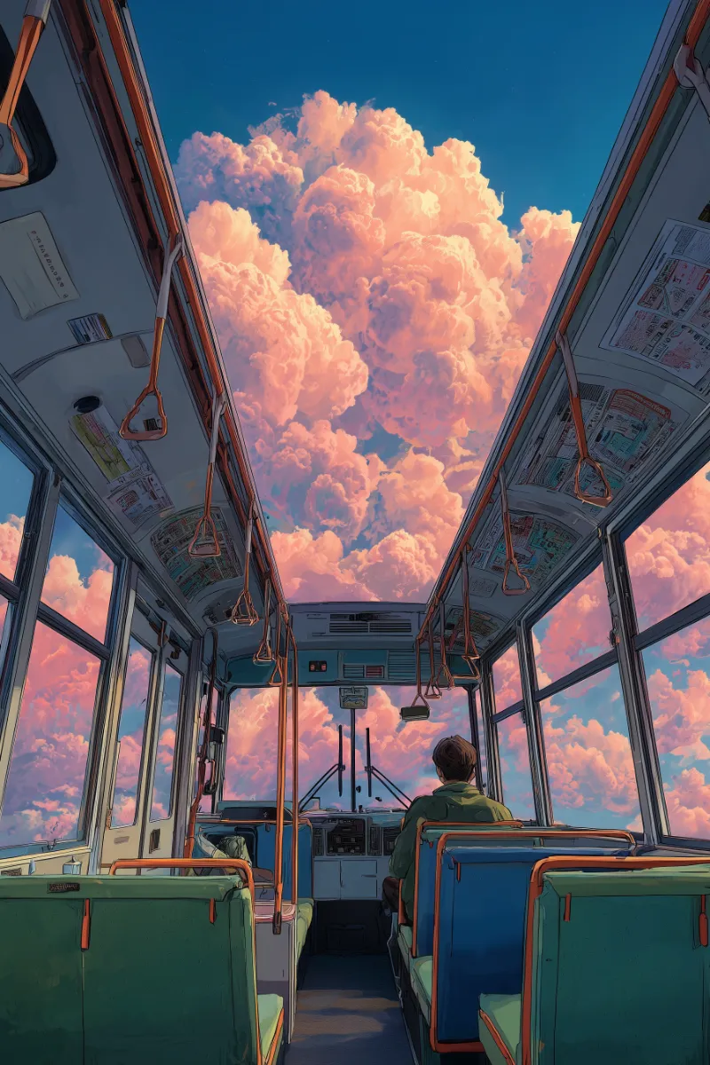 Surreal bus interior beneath pink clouds