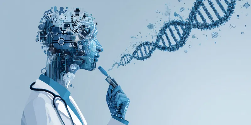 Futuristic doctor analyzing digital DNA helix