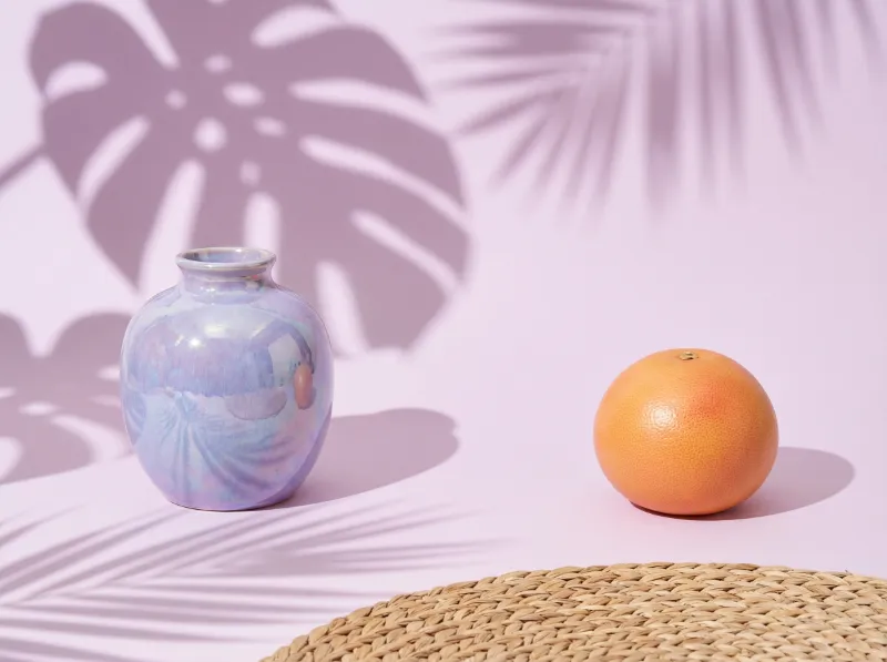 Pastel vase and grapefruit with palm shadows