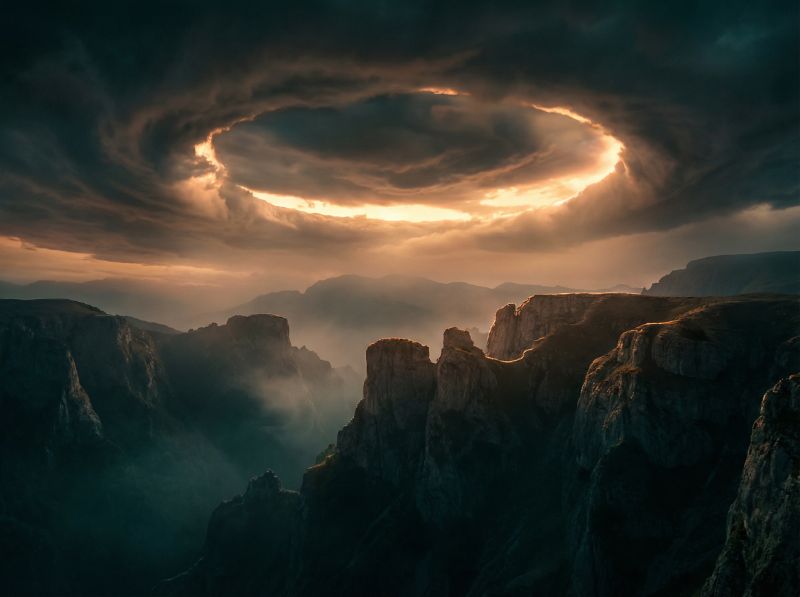 Dramatic ring of light over rugged mountains