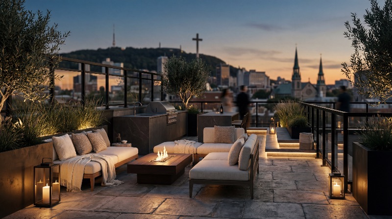 Modern rooftop terrace at sunset with fire pit