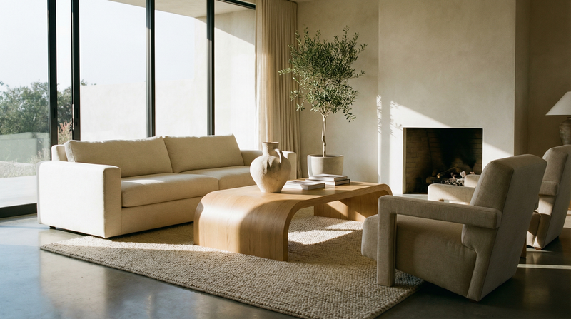 Minimalist neutral living room with natural light